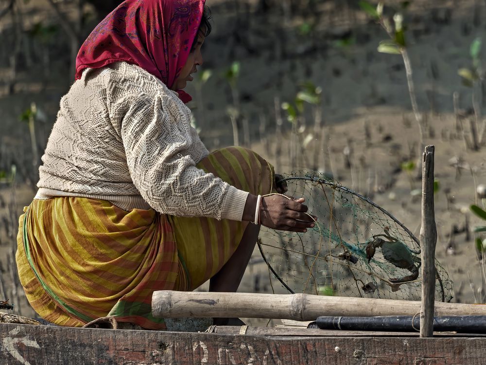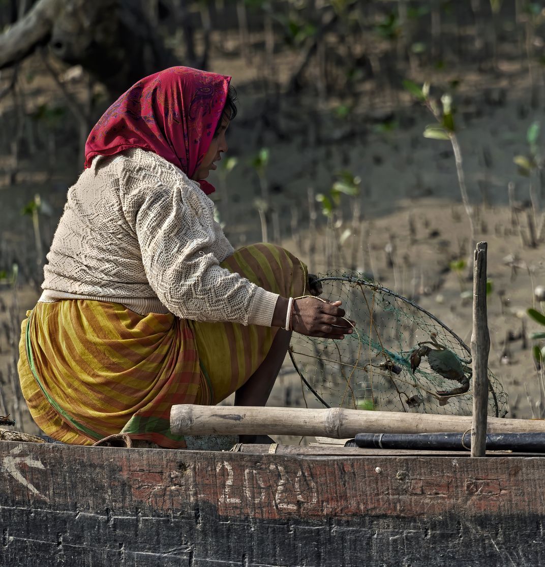 In rural south bengal, hunting crabs are as popular as fishing as an occupation, and both males and females participate in it. Here a lady was clicked during her crab hunting.