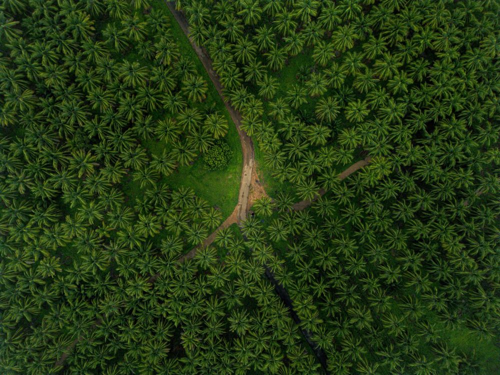 An aerial view of a cluster of coconut trees standing at the junction of a narrow road, forming a striking contrast between nature and human design. This small patch of green, surrounded by paths, reflects the quiet balance where life and movement meet.