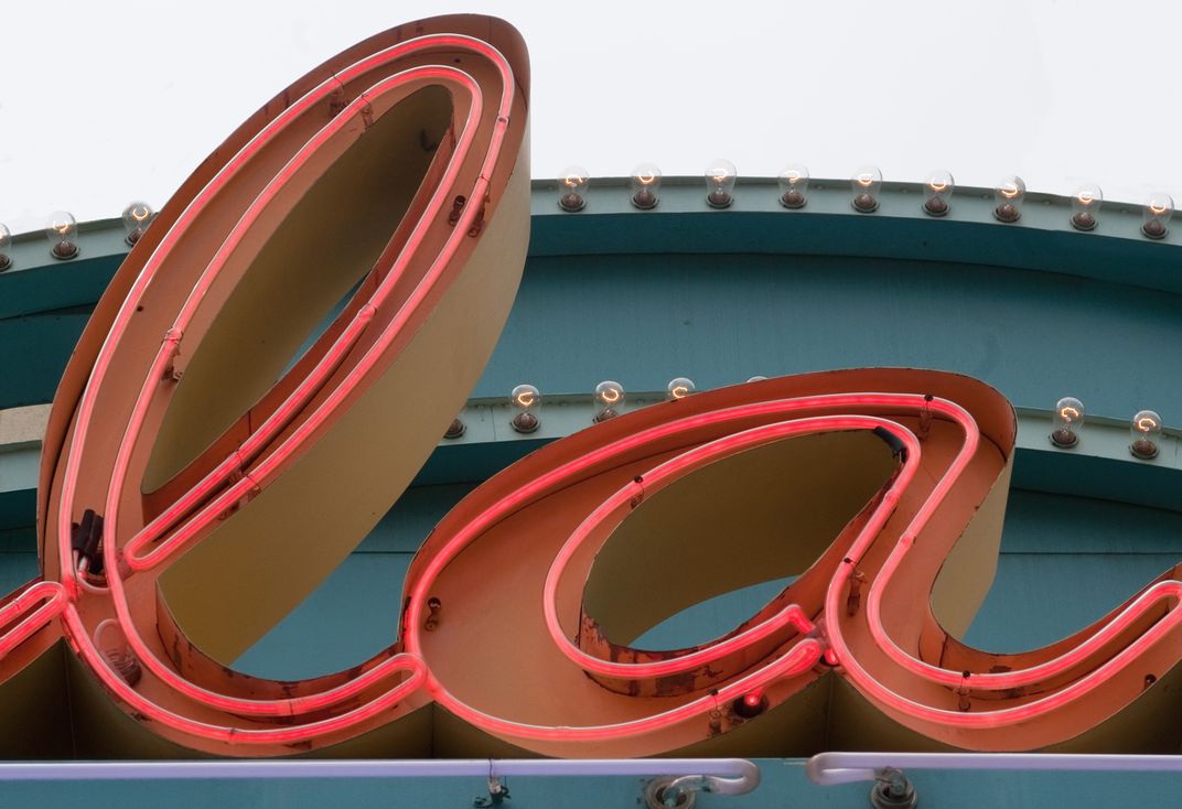 The cursive letters "la" beam from a neon marquee, capturing the romance of Hollywood and the idealized dream of fame and in Los Angeles, CA.