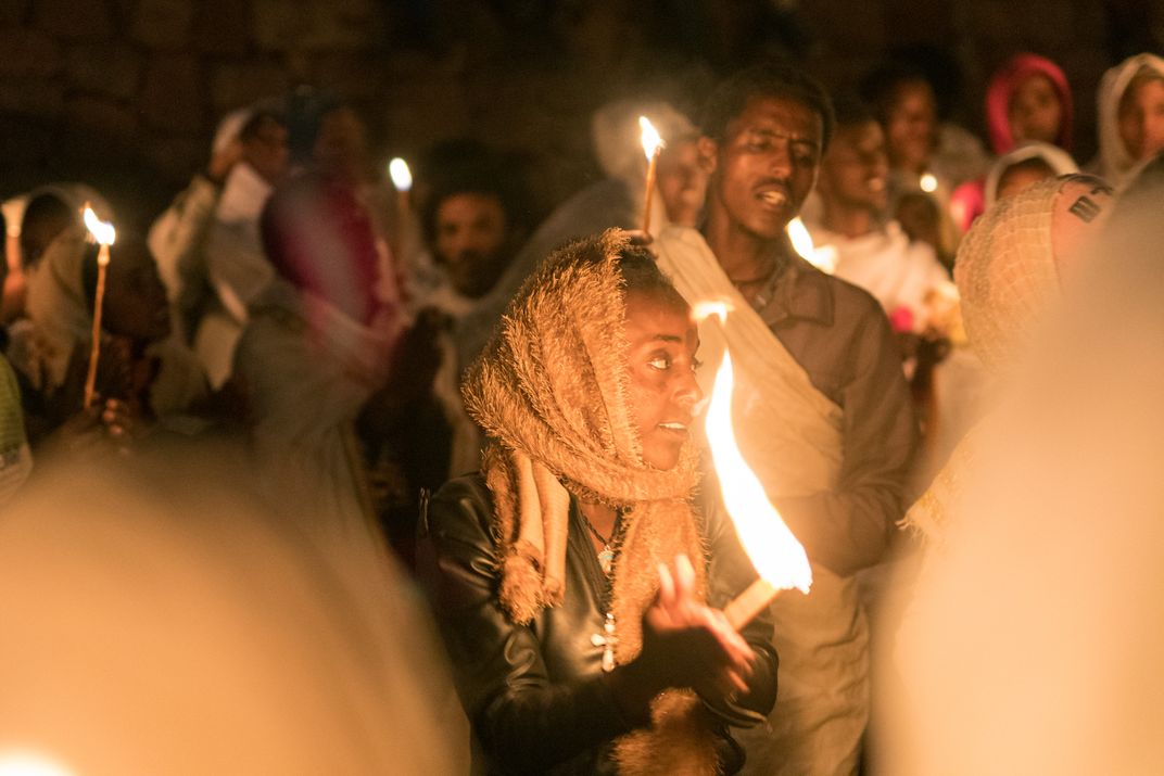 Deacons and pilgrims dancing in trance in the light of countless torches between Bet Emanuel and Bet Giyorgis churches, two of the rock-hewn churches of Lalibela as well as UNESCO World Heritage. It is a dance to praise the lord and celebrate the birth of Jesus Christ.