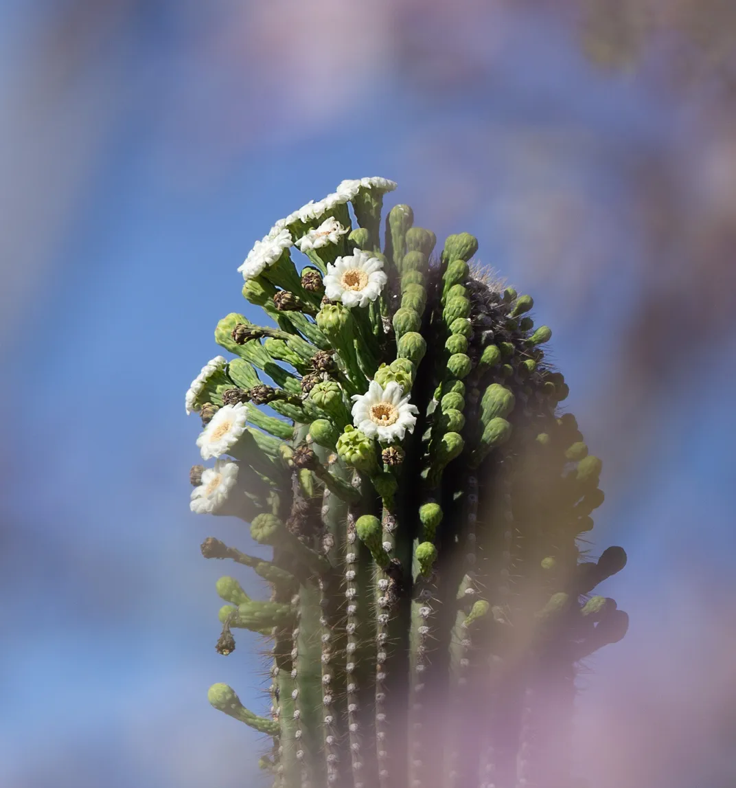 Saguaro cacti bloom in the spring, usually throughout May. A saguaro might have many buds, but each bud blooms for only a day. Fortunately, the blooms are staggered. This photo was captured in the middle of the blooming season as evidenced by the presence of dried up blooms, fresh flowers and unopened buds.