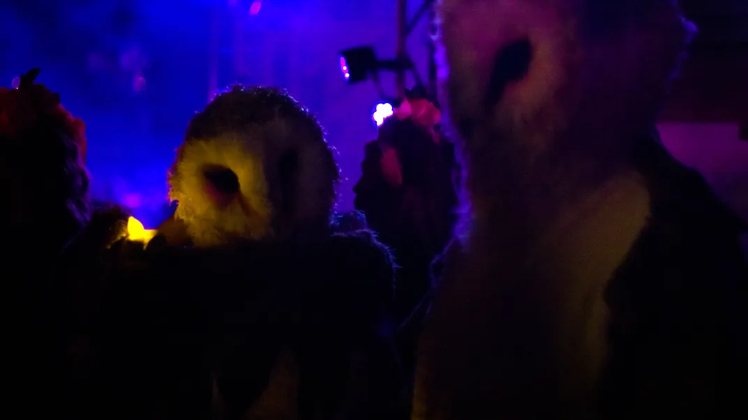 A portrait of two individuals dressed in elaborate and beautiful anthropomorphic barn owl costumes. taken on November 1st at the local Dia de los Muertos celebration in the plaza. Santa Fe, NM, 2025.