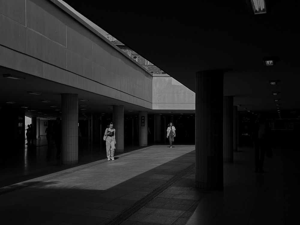 The Dividing Line. Captured while boarding a train to Vienna, this image isolates the moment of transition. The bright, diagonal beam of light visually and symbolically divides the subterranean tunnel, creating a "pocket of light" for the figure. This high-contrast monochrome study uses the architecture’s stark geometry to emphasize themes of solitude and the individual's journey.