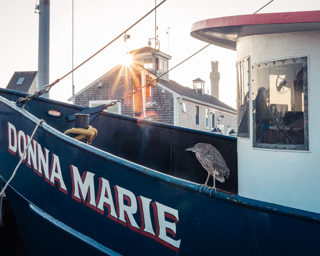 A bird sits on the bow of the Donna Marie, a boat docked on Macmillan Pier in Provincetown Harbor. The Pilgrim Monument can be seen in the background, above the bird. The tower is the tallest all-granite structure in the United States.