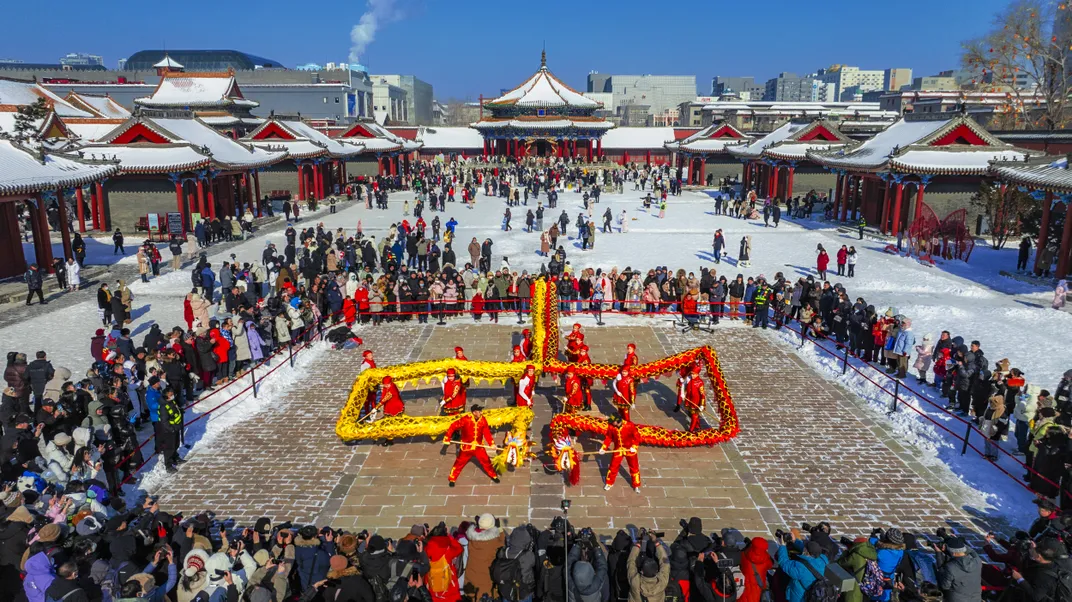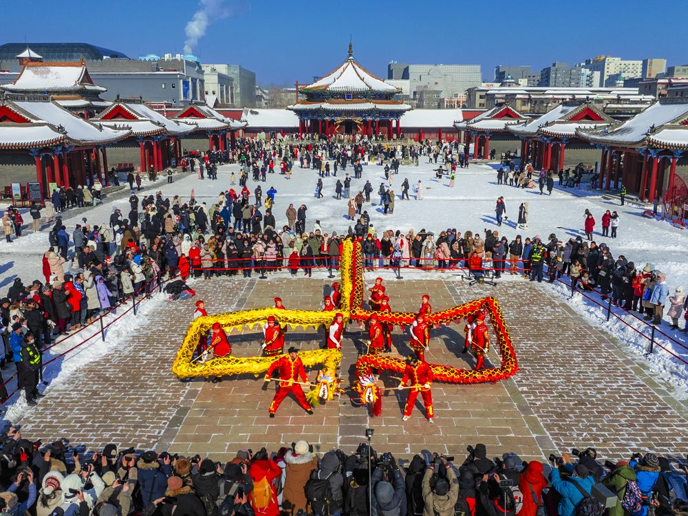 Photographed at the Shenyang Imperial Palace Museum on January 31, 2025. At the beginning of the new year, the Shen Imperial Palace Museum held a non-legacy project Jinzhou dragon dance performance, so that visitors from all over the place who came to visit here can feel the strong Northeast New Years flavor. This is the "middle" character shape performed by the Jinzhou Dragon Dance Team.