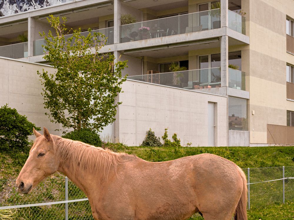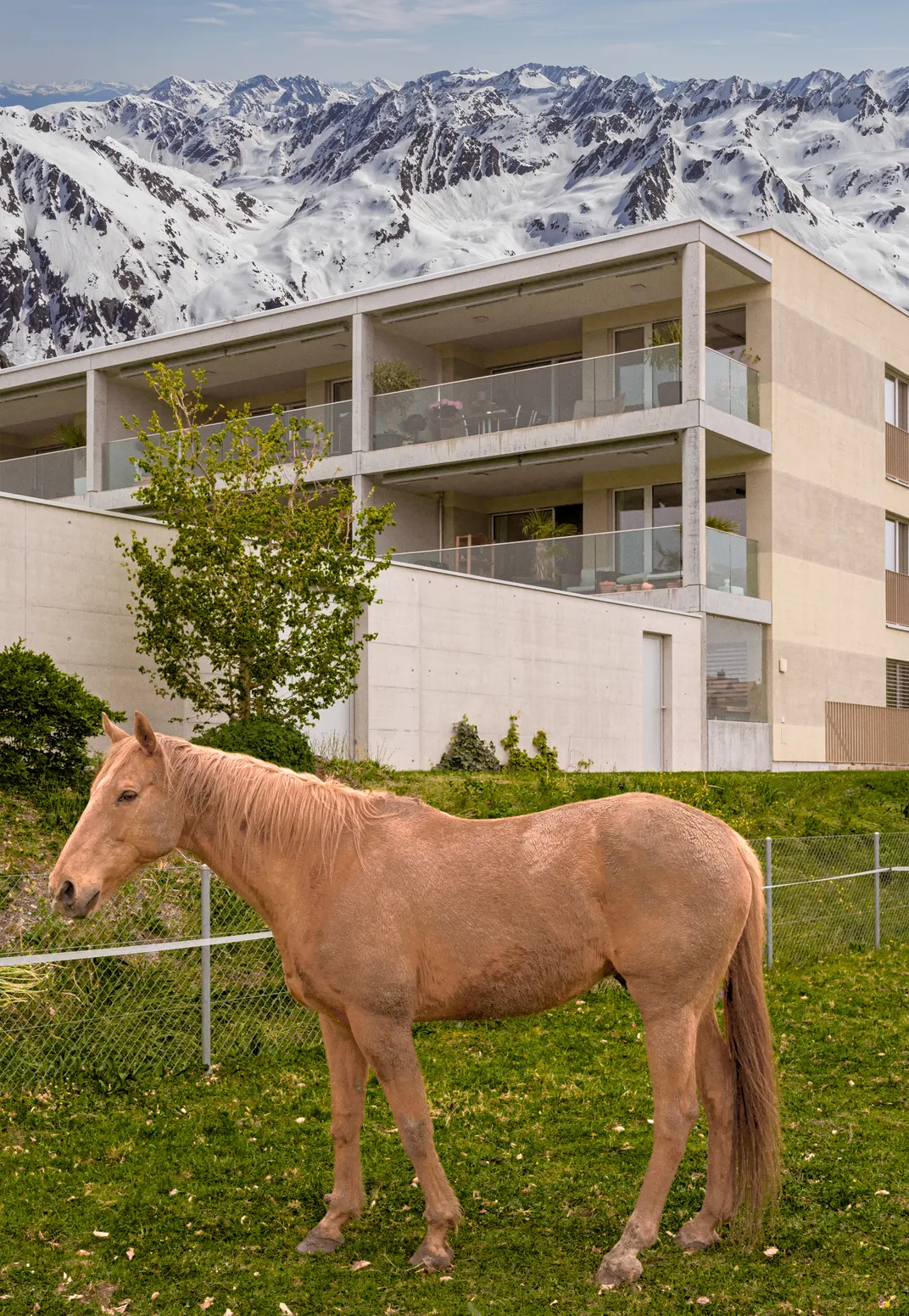 The view of the beautiful horse, the modern residential building and gorgeous snowy Alps in the background.