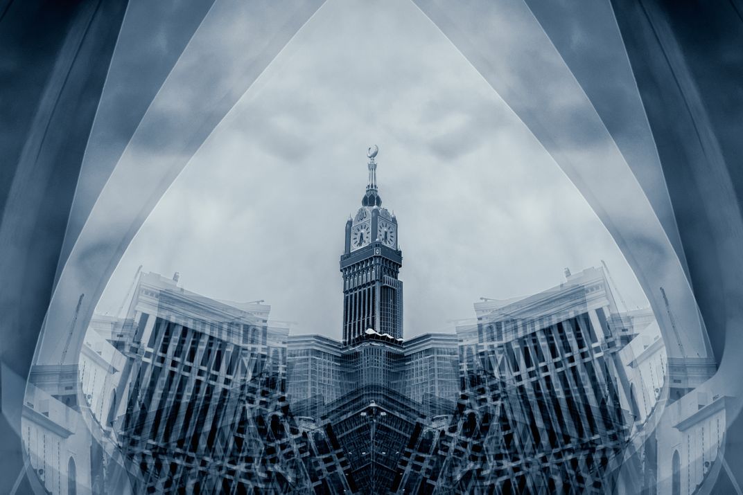 The iconic Makkah Clock Tower rises at the center of a mirrored architectural storm, layers of structure folding into one another, guided by a cold monochromatic palette. The scene transforms a familiar landmark into an abstract reflection on scale, repetition, and the quiet intensity of sacred space.
