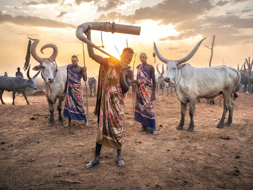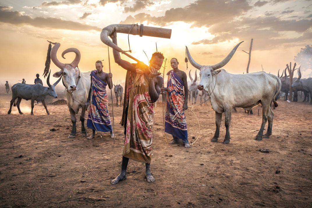 Mundari tribesmen during the traditional call used in the evening to summon their cattle back to the resting area (South Sudan). The Mundari are cattle herders who live in symbiosis with their Ankole Watusi cattle, characterized by their large horns. They use the ash created by the fires to rub on themselves and their cattle, creating a protection against mosquitoes. Mundari massage their bovines twice a day. In a cattle camp, everyone plays their role. The men lead the cows into the fields during the day. The cattle disperse from the banks of the White Nile river into the long grasses of the alluvial floodplain and they return at dusk instinctively before the sunset, when the dust lift by the herd and the smoke of the fires intermingle to create an evocative atmosphere. Few guardinas are sleeping with the cows. The ash from dung fires, as fine as talcum powder, is often used as bedding.