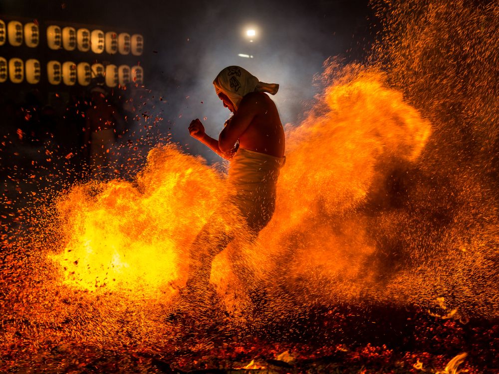 The Yassai Hossai Fire Festival is held in Osaka, Japan, on December 14 every year at Iwatsuta Shrine. The festival celebrates the god Ebisu and commemorates the time when fishermen burned 108 bundles of firewood to keep Ebisu warm after he washed ashore. The most impressive scene of the festival is when men wearing white clothing run through fire cheering "Yassai Hossai."
