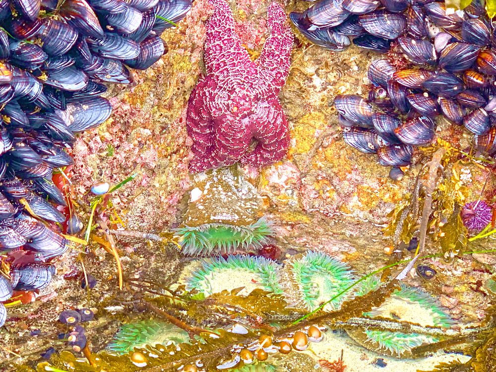 Deep in granite rock crevices, tidepool animals form collaborative images while foraging for mollusks. Ochre sea star nose, surrounded by California mussels cascading to green sea anemone mouth. Fierce carnivores: the ochre star is eating the mussels, while the green sea anemone is feasting on snails.