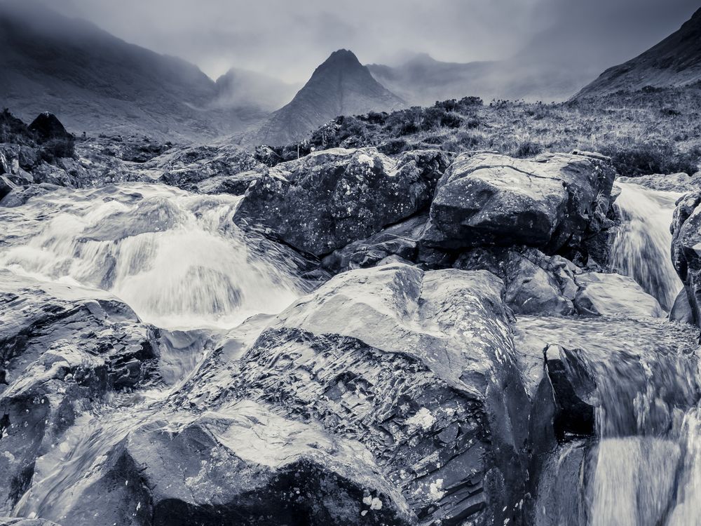 on a trip to the isle of Skye in Scotland. I visited the famous fairy pools. The weather wasn't great but it made for this dramatic and moody shot.