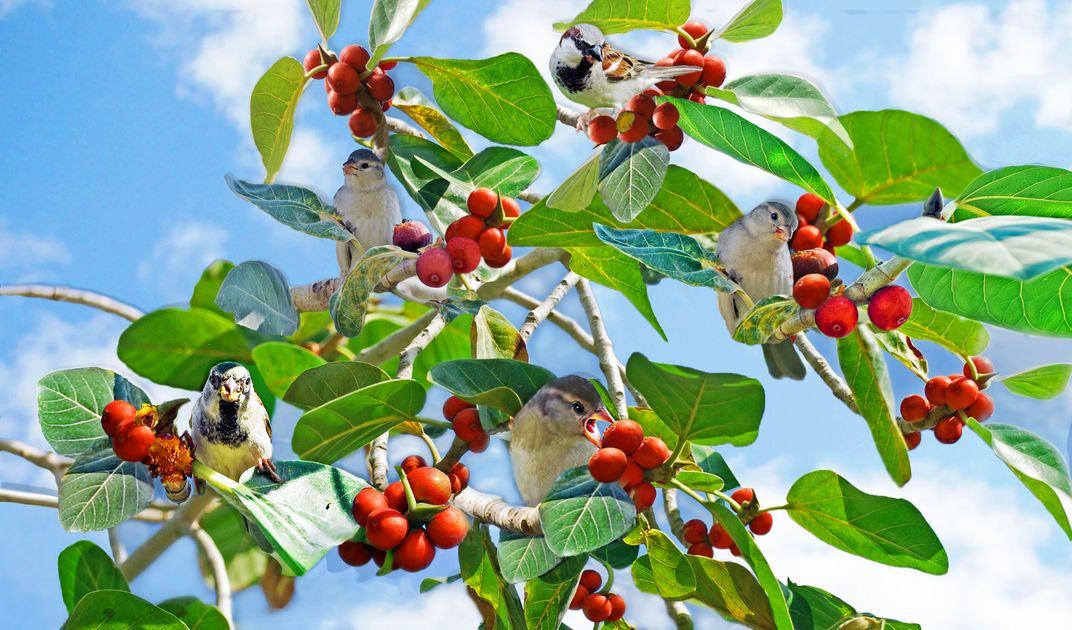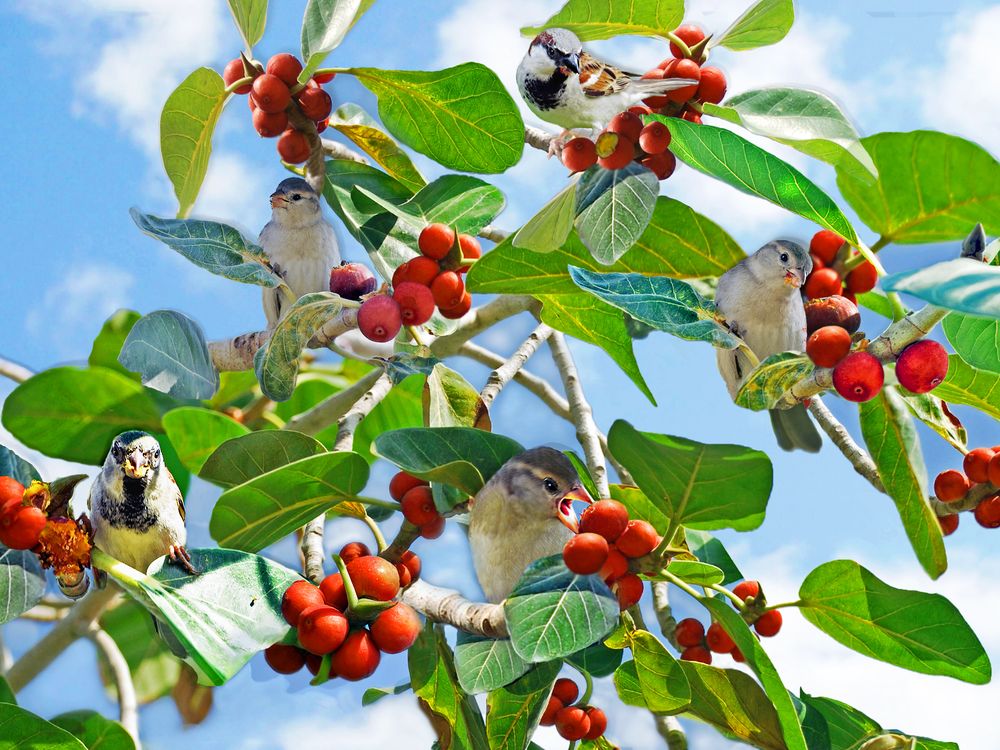 Five housesparrows sitting on the branches of a banyan tree and eating the ripe red figs at a park in Sharjah, UAE.