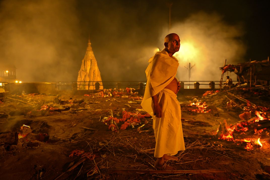 A chief mourner, head shaved and dressed in white ritual robes, stands amidst the cremation fires of Manikarnika Ghat. Behind him leans the submerged Ratneshwar Mahadev temple. In this ancient space, he oversees the final rites, fulfilling his sacred duty to the departed.