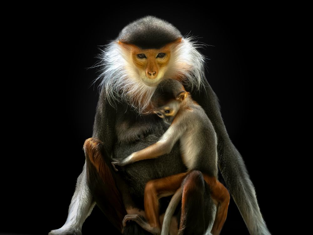 Red-shanked doucs are often called “the most beautiful monkeys in the world.” Their fur looks like it was painted with every color of the palette —yet what truly moves us is the tenderness of a mother holding her baby.