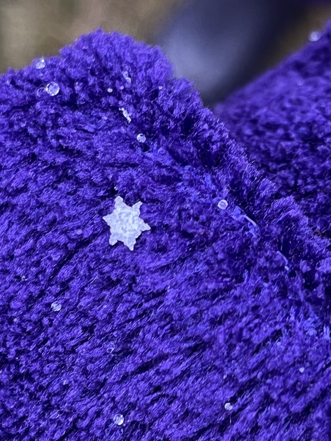 The first snowfall of November 2022, a flake perched on purple polar fleece.