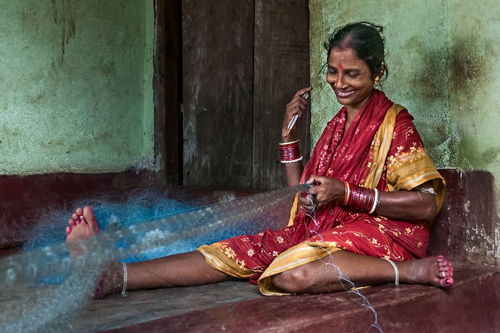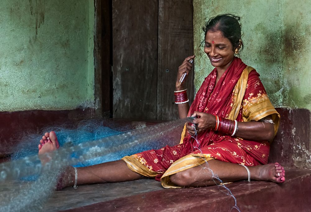 The fisher-woman is weaving e fishing-net.