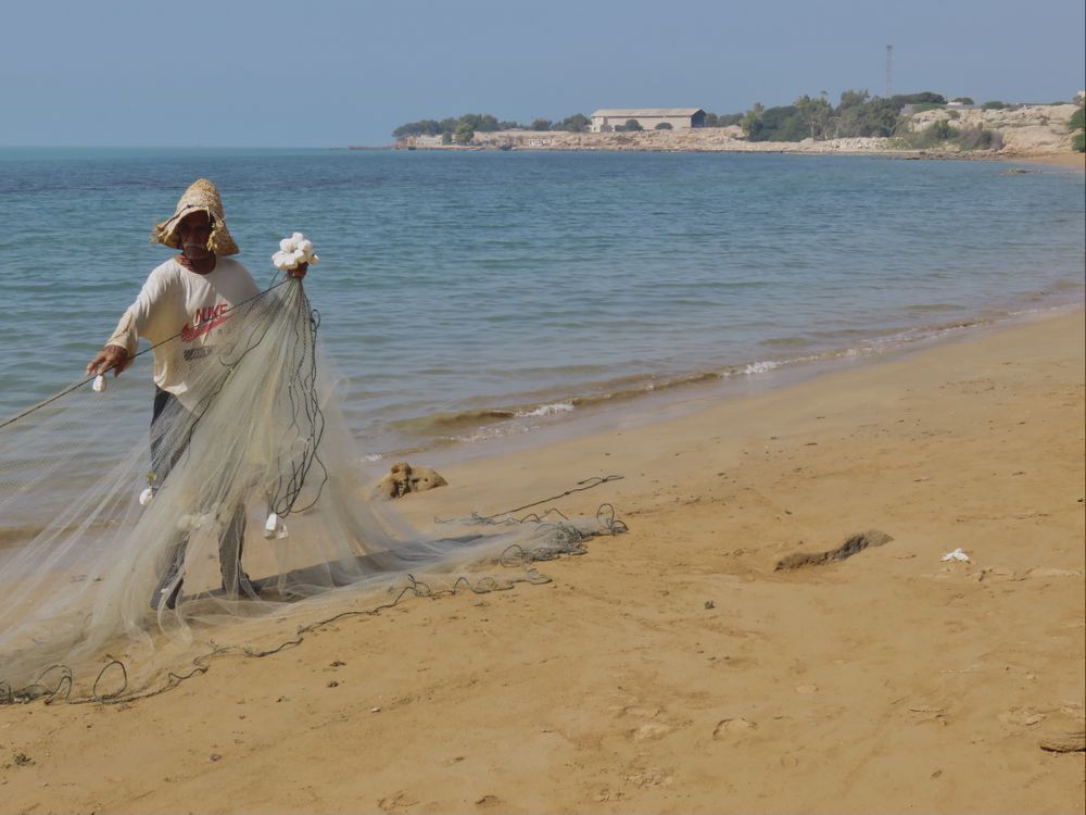 The fisherman was doing his job in a sunny and warm noon. It shows the hard work of Men, the people that try hard to just earn a little money to bring home some bread, the job that most of our fathers did.