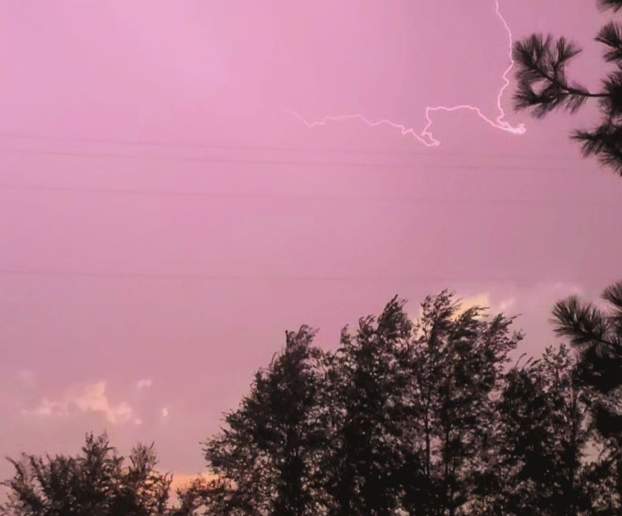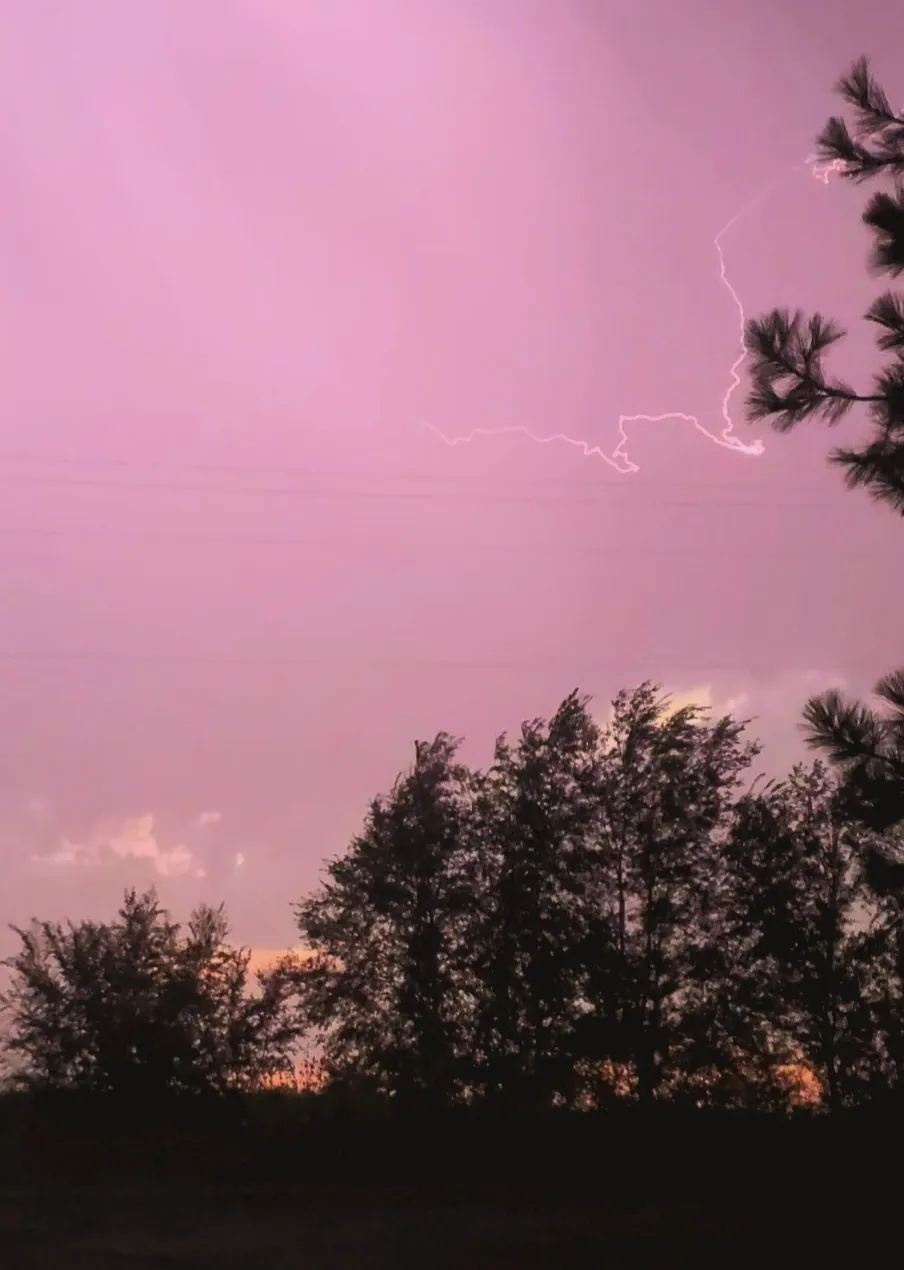 The flash of pink/purple that happened during a lightning storm and the sun setting.