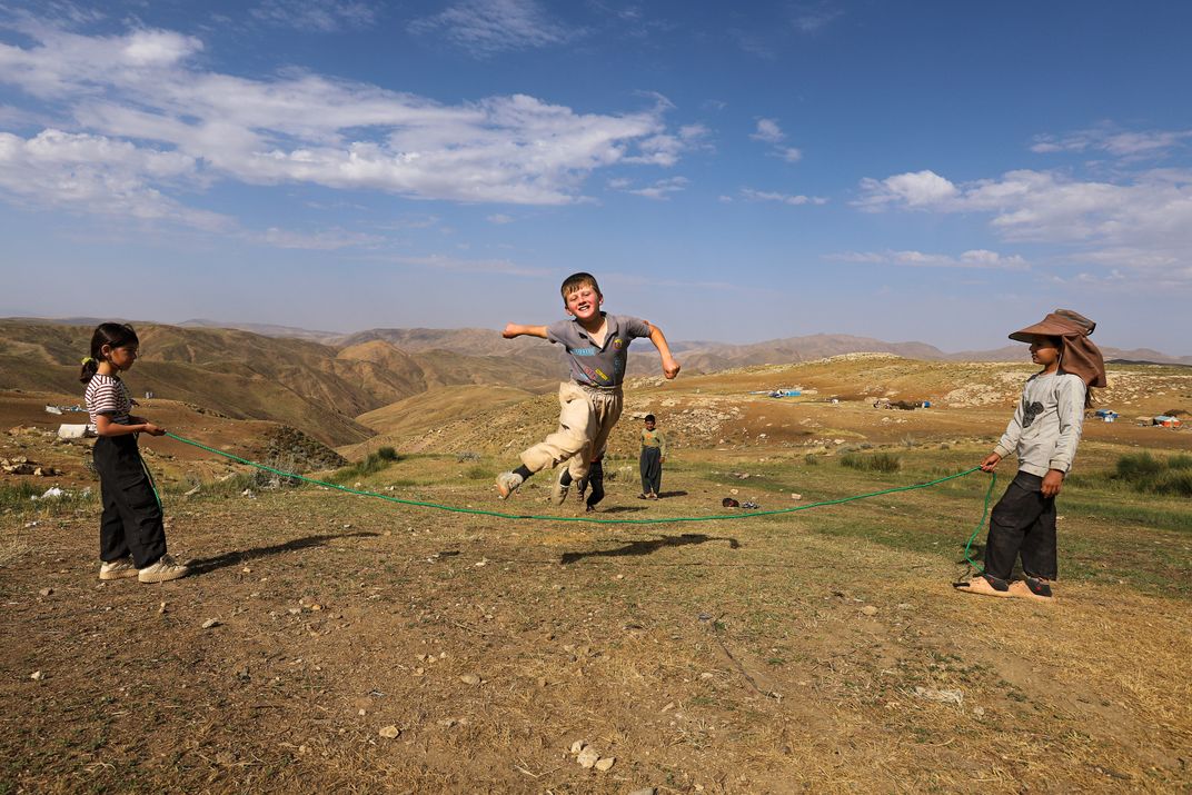 Far from snacks and the virtual world, nomadic children entertain themselves with traditional games in the mountains, in addition to helping their families. One of these games is rope jumping. Each child takes turns jumping on the rope.