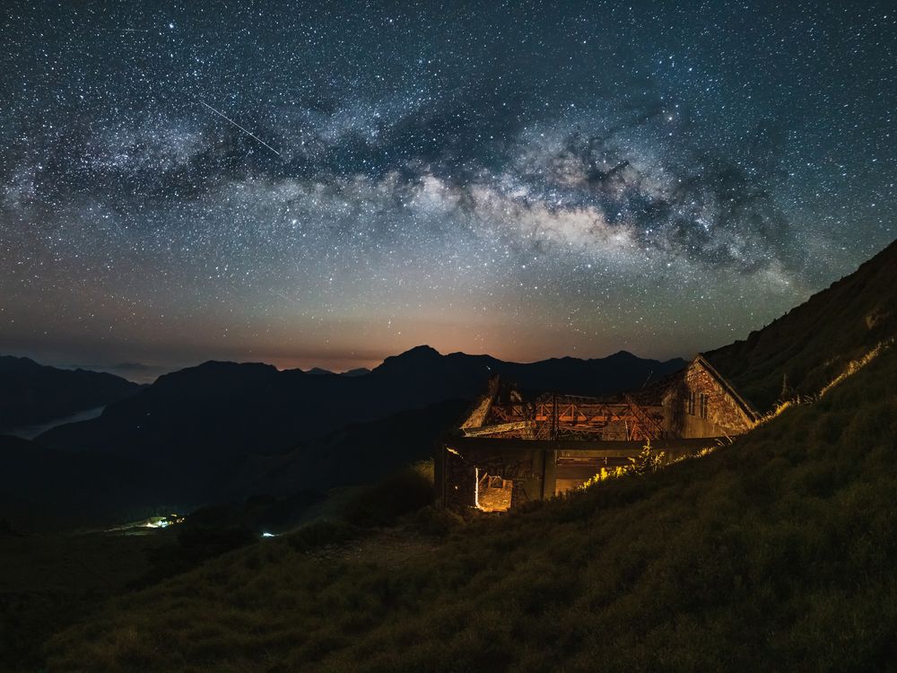 In the deep mountains, an abandoned cable car station glows softly in the faint light. Overhead, the Milky Way stretches across the ridges, and a shooting star slices through the silent night sky, as if carrying echoes of past laughter back to this terminus left behind by time.