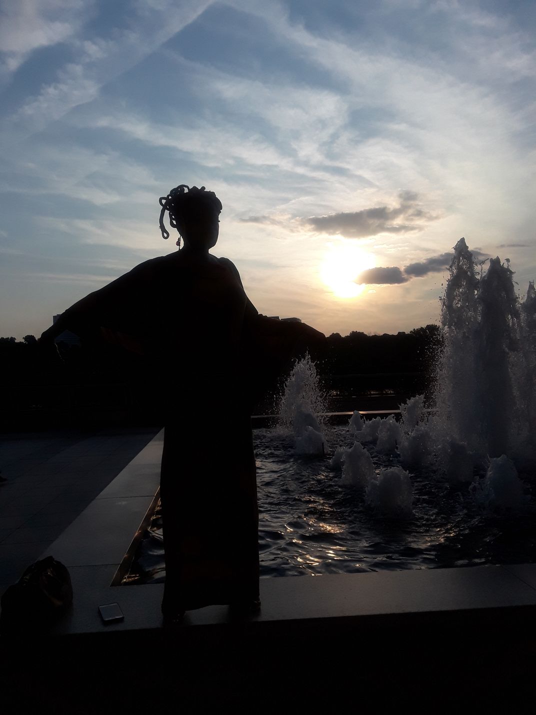While waiting for the curtain call for the famous play, Hamilton, C. Wilborn, a fashion designer from LA, takes in the view of the fountains and setting sun on the veranda of the Kennedy Center in Washington, DC.