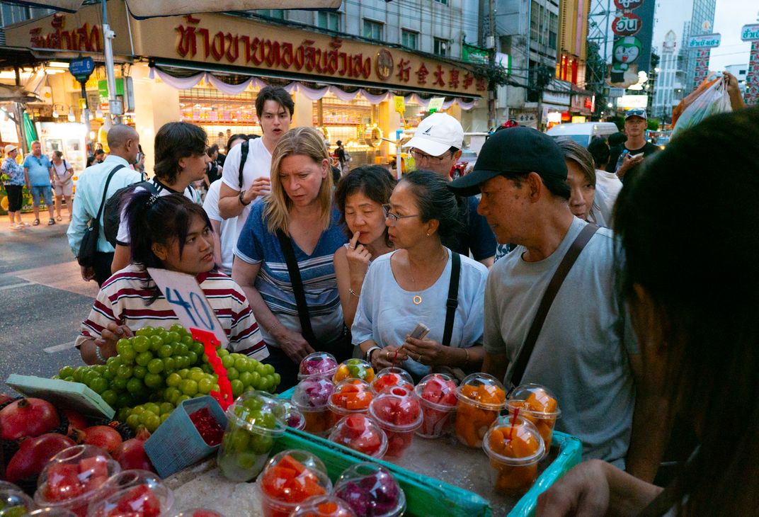 In the early evening on a street in Bangkok’s Chinatown, many vendors, local residents, and foreign tourists can be seen. The woman selling fruit seems to be explaining something to these people from different places. They appear not to fully understand, or seem surprised, or puzzled. The overall composition of the scene and the expressions bear a resemblance to Rembrandt’s “The Anatomy Lesson of Dr. Nicoleas Tulp”.