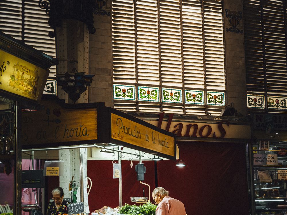 A vendor works at her stall in Valencia's bustling Mercat Central. The vibrant display of fresh produce and her focused expression capture the lively energy and rich culinary culture of one of Europe's oldest and most beautiful food markets.