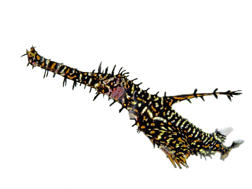 Ornate ghost pipe-fish. This is an in-usual find in NSW, they have been stranded in large number this year by the current. The white background is semi-artificial as it is very bright and pale to start with, I used the reflective sand to obtain it
