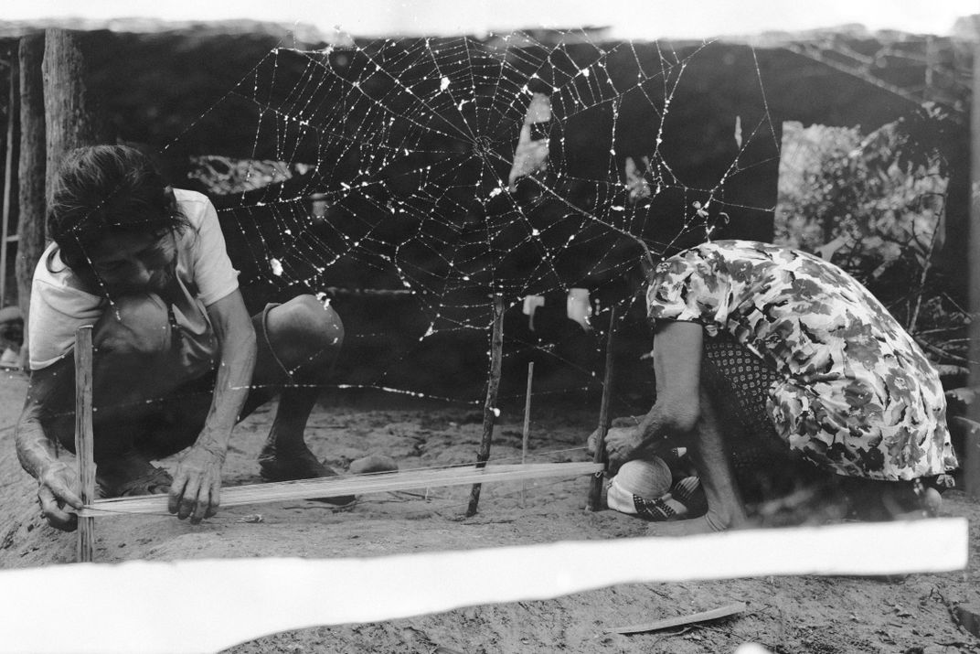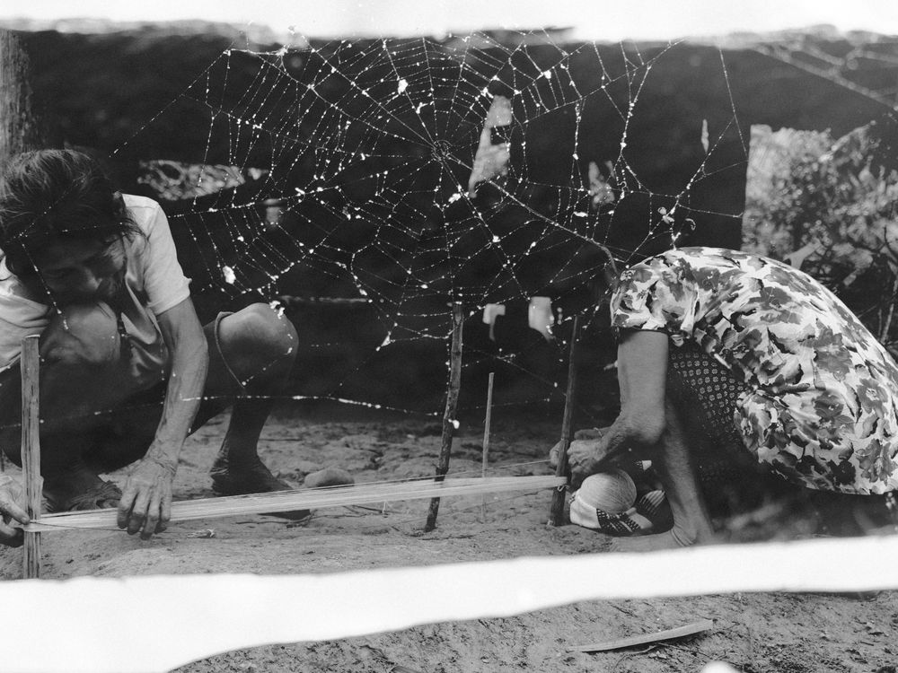 For the Yanesha’, many ancestral teachings came from eternal beings sent by their Sacred Father. The art of weaving cotton was a gift from Arankmena, the mother of all spiders. In this photo, sisters Yolanda and Dominga weave their cotton beside a spider spinning her web, recalling that sacred connection.