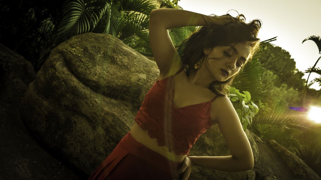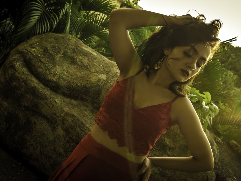 Girl with a red dress and a sun shining