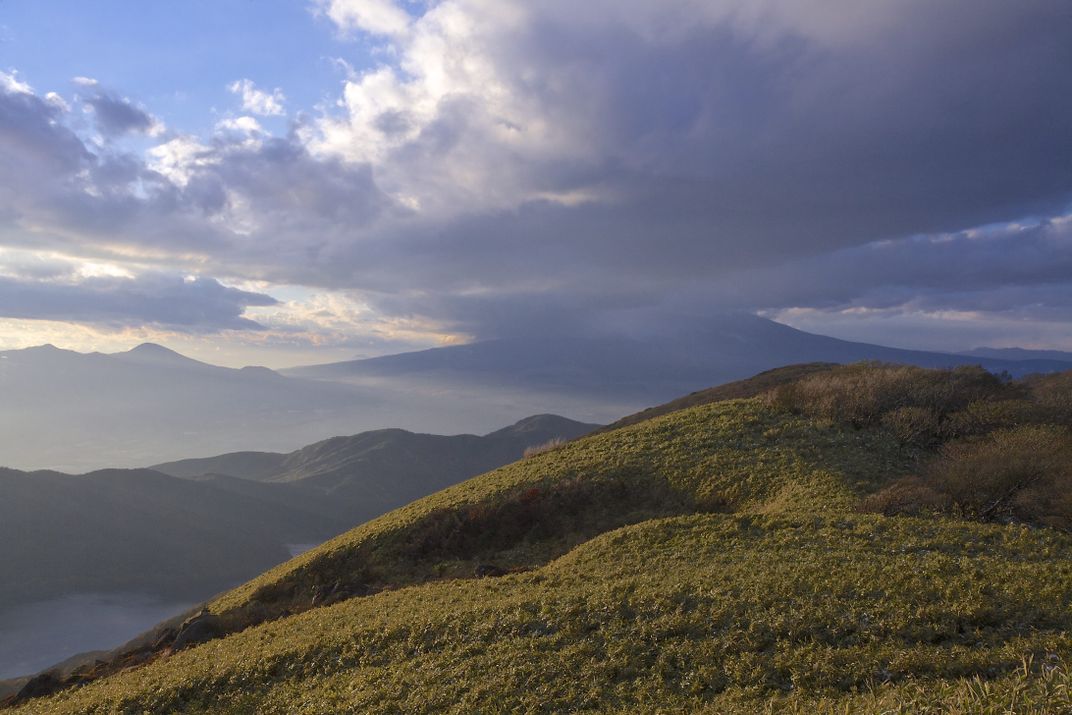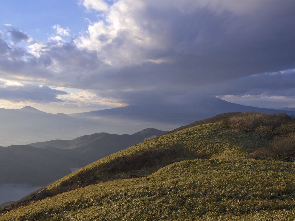 The gloomy clouds lingering over Mount Fuji fail to spoil the view from the top of nearby Mount Komagatake.