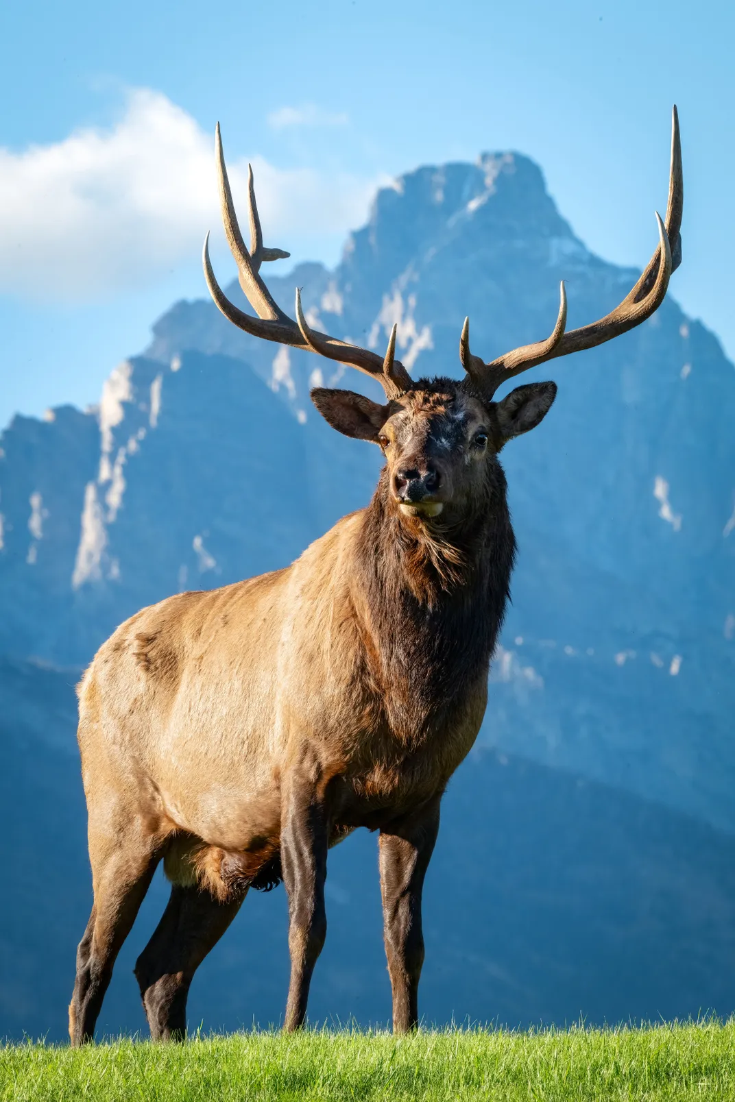 A bull elk poses regally in front of the iconic Grand Teton.