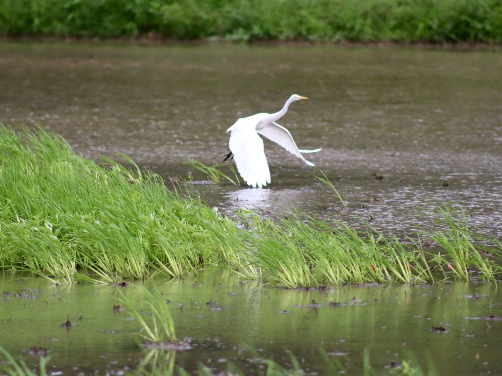 A great egret gliding freely across the paddy field — such a simple beautiful sight.