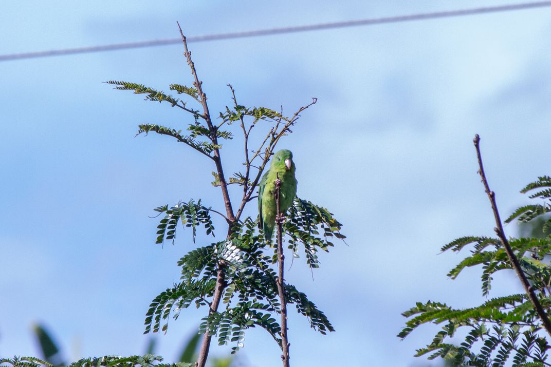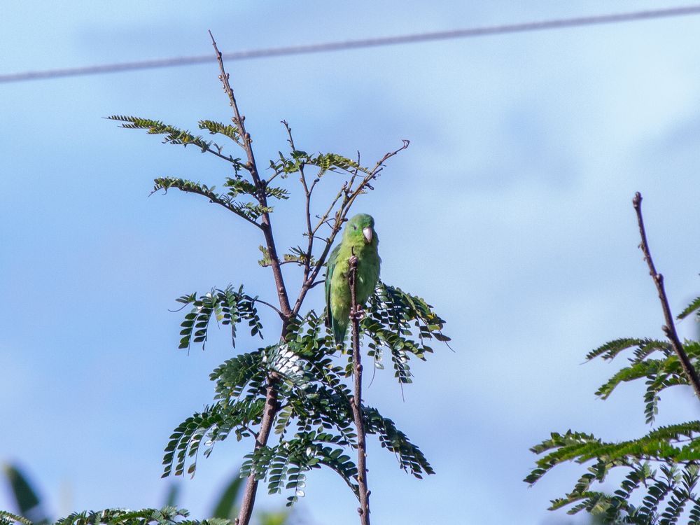 This portrait captures a beautiful parrot or parakeet (likely from the Forpus or Brotogeris genus, common in the Andean region), perched boldly on the highest point of a young tree, observing the horizon under a vibrant blue sky. The scene illustrates the persistence of wildlife in the green spaces that abut the urban infrastructure of the city.
