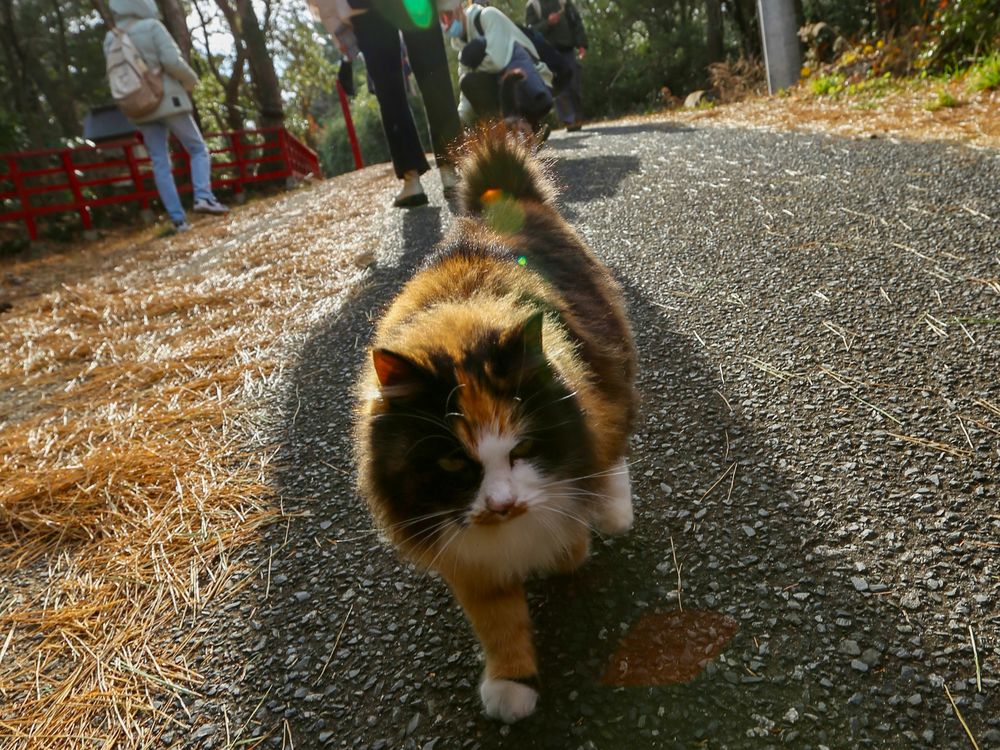 A calico cat confidently strolls down a path on one of Japan's famous "Cat Islands." Bathed in the warm backlight of the afternoon sun, the cat leads the way for visitors, embodying the unique charm and coexistence of humans and felines in this remote destination.