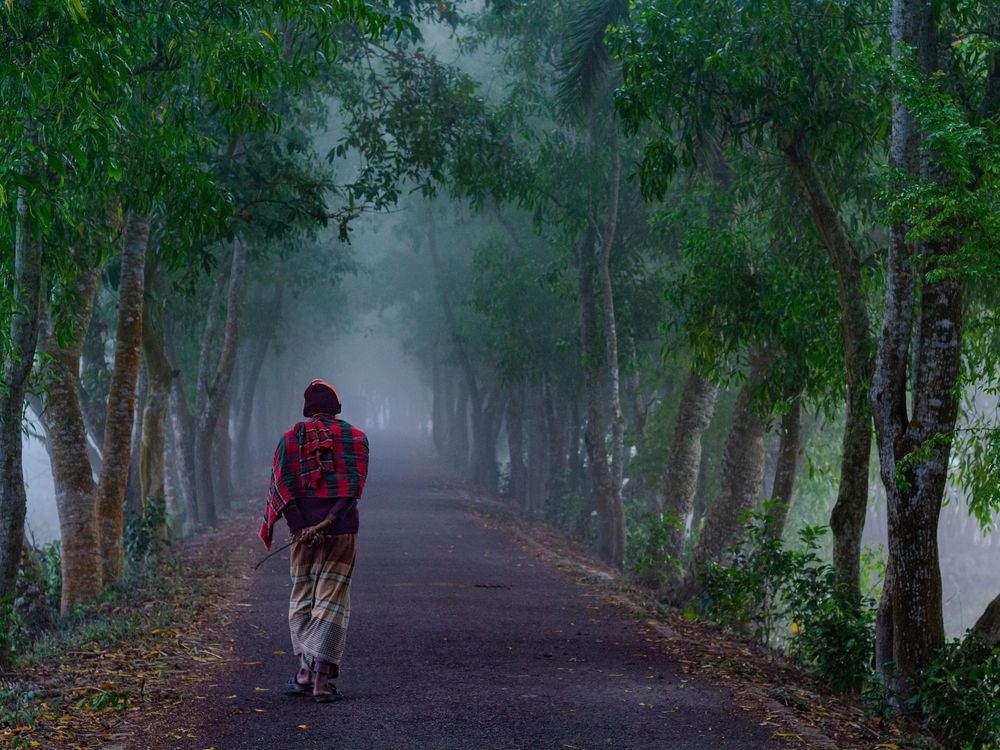 In the picture, a farmer walks along a foggy road with a sickle in his hand. It was taken on a very cold morning. He walks through green trees on both sides, the trees holding the road like guardians. His running through the fog reflects his struggle and commitment to his work. His red kerchief and green nature reflect his nationality and culture.