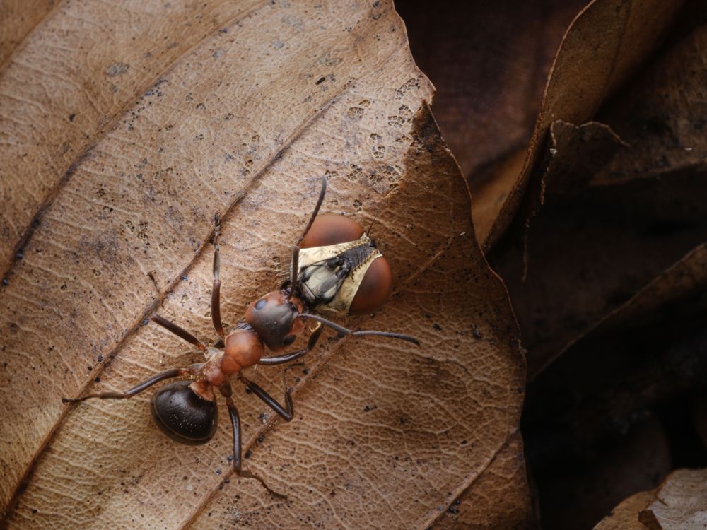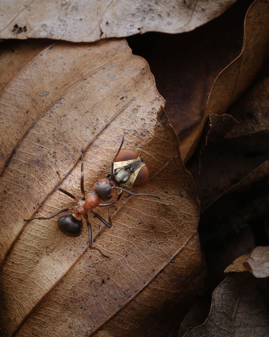 Take another close look...do you really understand what you see here? An ant carrying a head of a fly, as if the fly just came out of a guillotine.