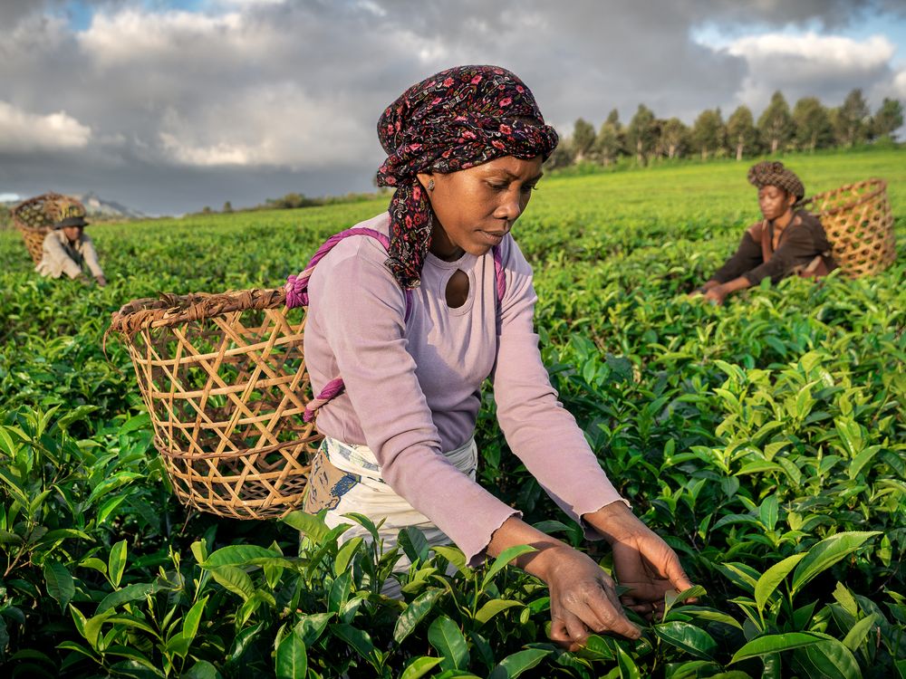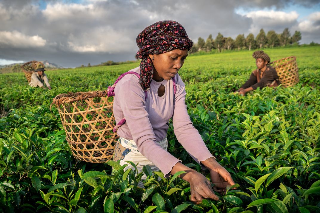 Portrait of a tea picker at work (Madagascar). During the harvest season, hundreds of workers move through the tea bushes each day with practiced gestures, collecting the youngest leaves by hand. In Madagascar, tea is grown only in a central highland region where the climate and altitude provide ideal conditions for cultivation. The entire national demand is met by this single production area. This work is essential for the local economy. Many of the pickers are women, and the wages they earn help support their families in an area where employment options are limited. For households in this rural region, tea harvesting offers one of the few sources of regular income. In addition to direct employment, the tea fields also support small-scale farmers who manage part of the land and contribute to the supply. The work in the plantation helps sustain the livelihood of entire communities, providing both economic stability and a sense of continuity in daily life.