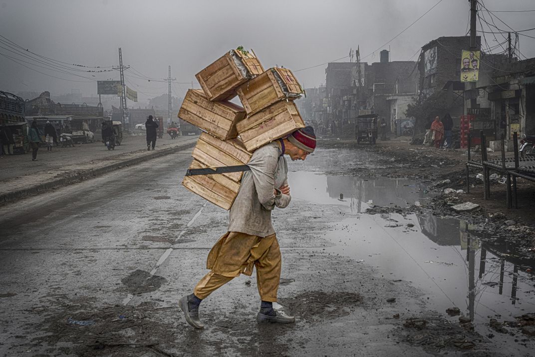 Un trabajador atraviesa una calle de Peshawar bajo la niebla, cargando cajas de madera sobre su espalda. La escena refleja la dureza y la dignidad del esfuerzo diario en Pakistán.