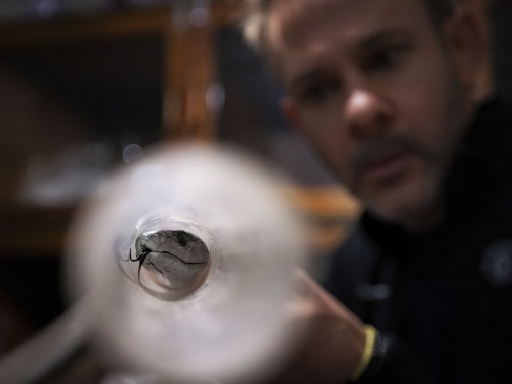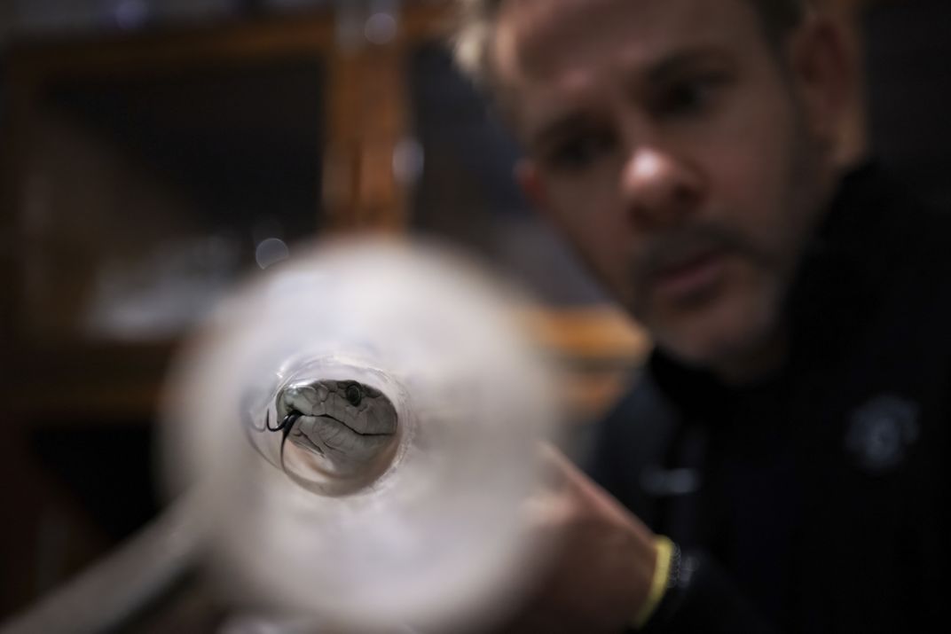 A tubed black mamba flicks its tongue after a harmless heart-blood draw for rapid antivenom work. Filming with Dominic Monaghan and Donald Schultz at Snake Pharm in KwaZulu Natal showed new one hour antivenom methods for a region with high snakebite deaths.