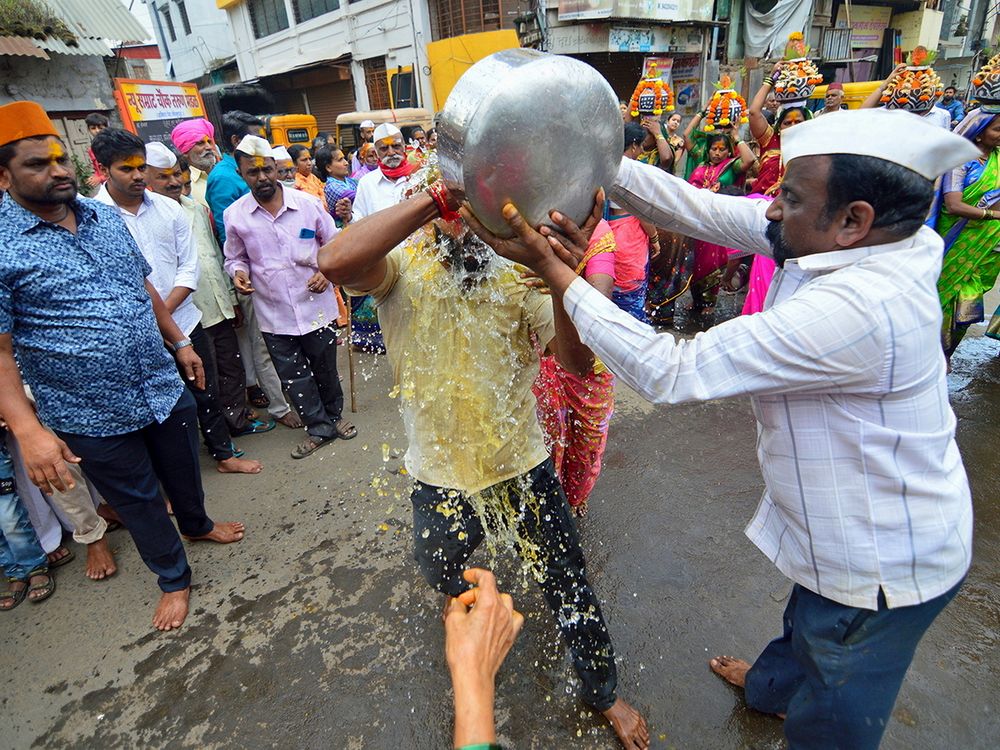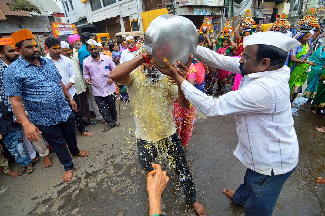 A moment from the Ashadhi Trimboli Yatra. During the Hindu month of Ashadh, water is collected from the river after the rains start and it is offered to Goddes Trimboli in my city. A bath is given to the person who gets the chance to lead the celebrations while on the way to the temple.