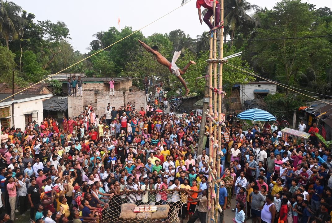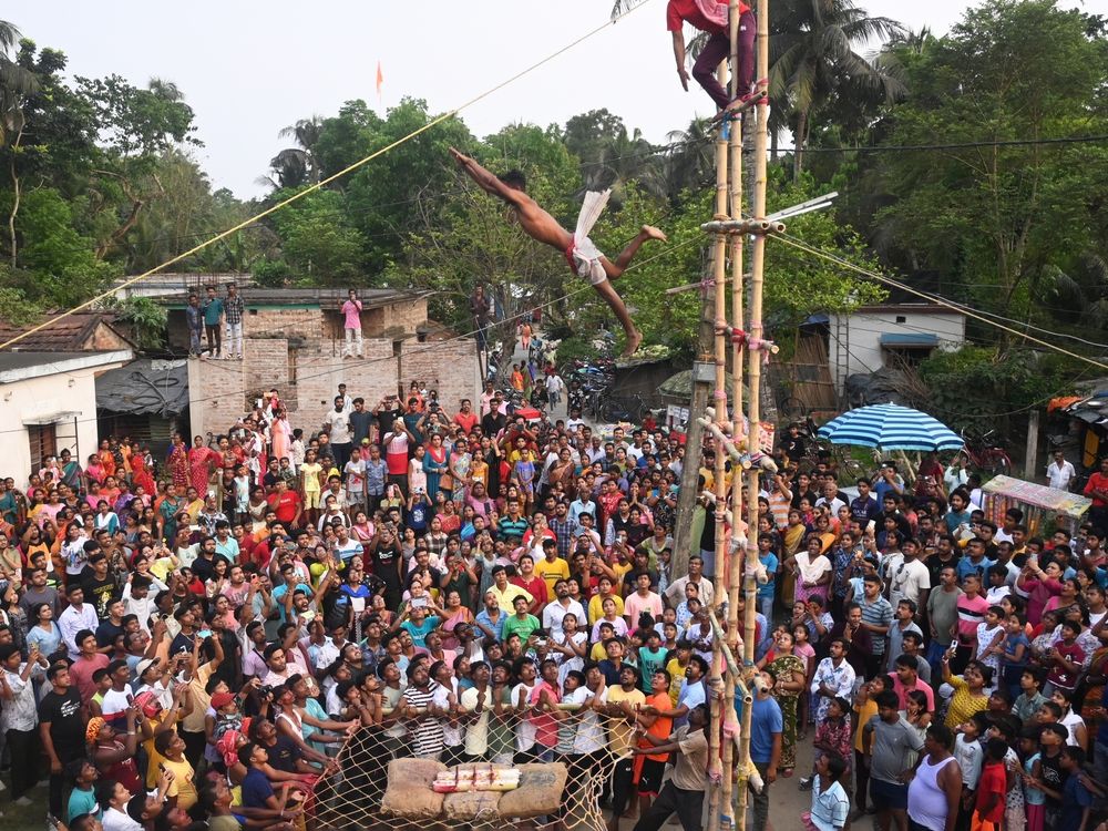 The holy jump in the Gajan festival. It's a religious festival of the Hindus. People jump on open blades and remain safe. It's a matter of stern practice. For the onlookers it's a thrilling experience.