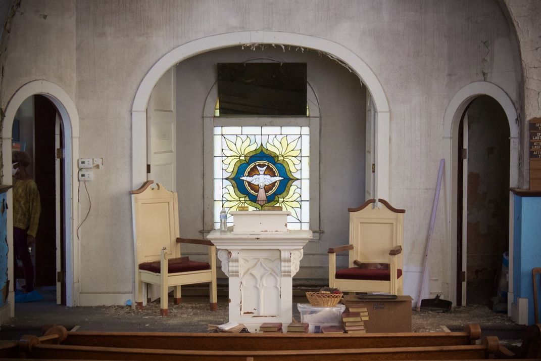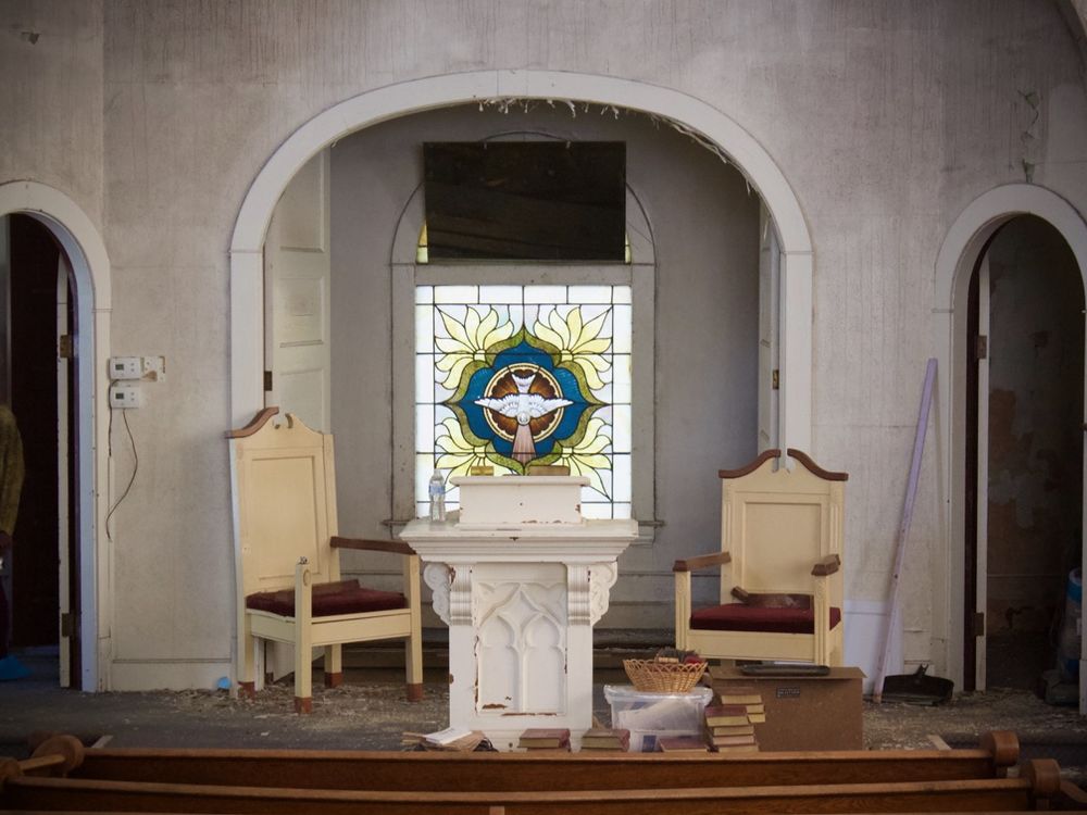 A focused view of the altar area of the historic Mount Zion Baptist Church in Athens, Ohio. The stained glass window, featuring the Dove of the Holy Spirit, is positioned directly above the baptismal font, emphasizing the spiritual foundation of this crucial Black community gathering place.