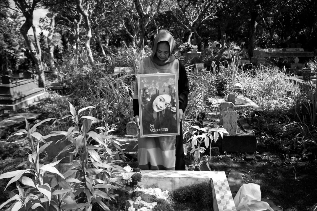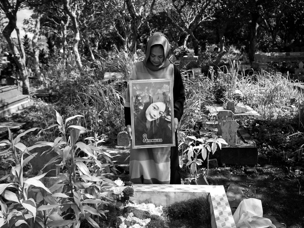 Siti Mardiyah (Kholifah) stands beside her daughter Mitha Maulidia's grave in Malang. Her grief represents the private sorrow of 135 families. She will return again later today. Mitha was one of the 135 people killed on October 1, 2022, in the Kanjuruhan Stadium tragedy, where authorities fired chemical tear gas into a locked, overcrowded arena. This singular act of a mother's constant presence, visiting Mitha's resting place multiple times every day, is more than grief. It is a terrifying, continuous act of devotion that holds the system accountable. This photograph is the unbearable quiet after the screaming stopped, a permanent, living monument to the lives lost to preventable failure.