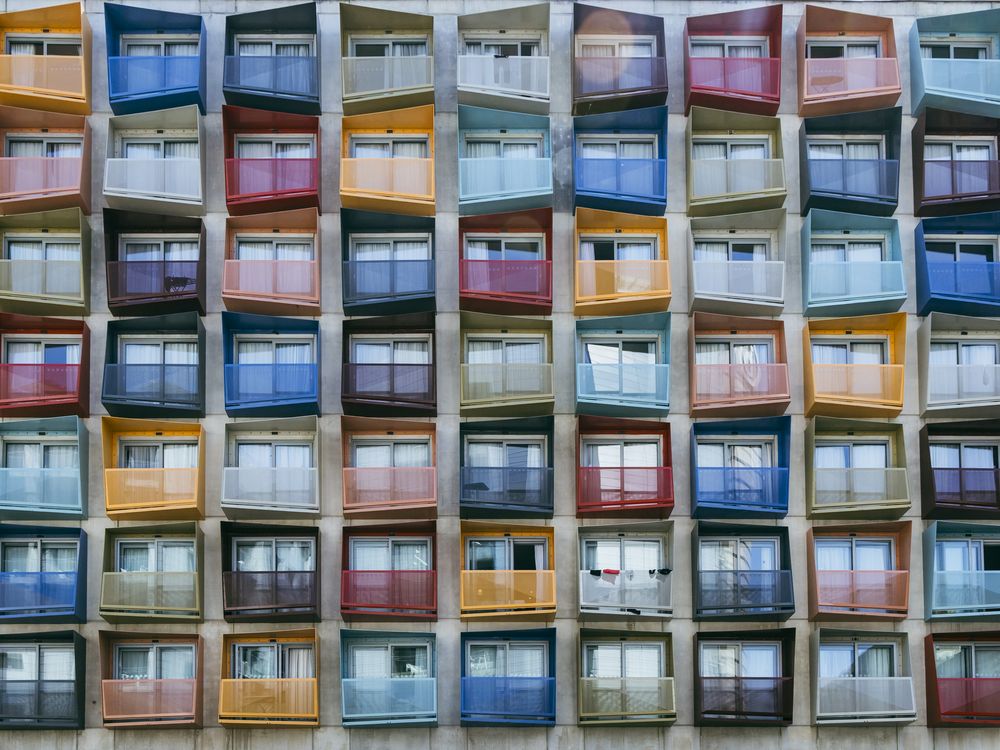 A residential building becomes a vibrant tapestry of repeating balconies in shifting colors. Each unit reflects a different story, yet together they form a striking urban kaleidoscope.