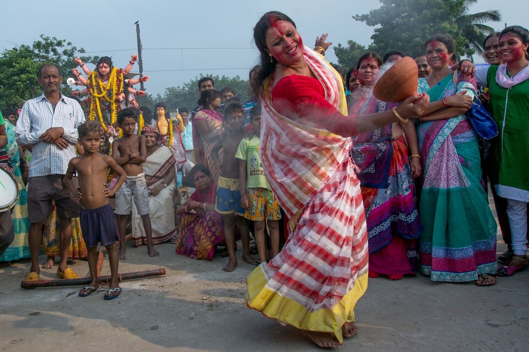 A lady dancing with a incense pot in front of the Goddess Durga, prior to the immersion of the deity in the river Ganges.