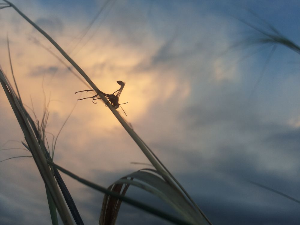 Evening. Wind. The insect is held on a stalk of a feather grass. The clouds are unusually picturesque against its background.