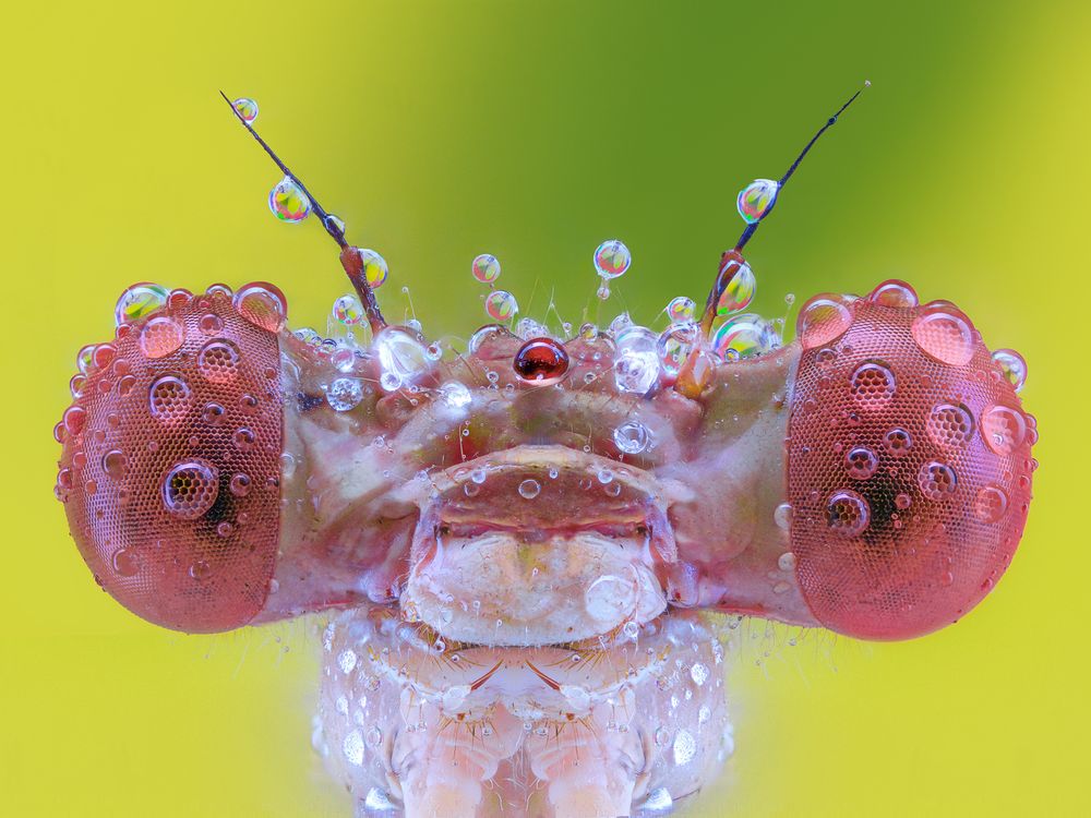 The image shows an extreme close-up (macro) photograph of an insect’s face, likely a small fly or similar species. Its large, red compound eyes dominate the image, each eye covered with intricate hexagonal facets. Numerous tiny water droplets cling to the eyes, antennae, and head, creating a sparkling, jewel-like effect. The droplets also reflect colorful light, adding a rainbow shimmer. The insect’s antennae extend upward, also dotted with droplets. The background is a smooth gradient of yellow to green, which makes the vivid details of the insect stand out even more.