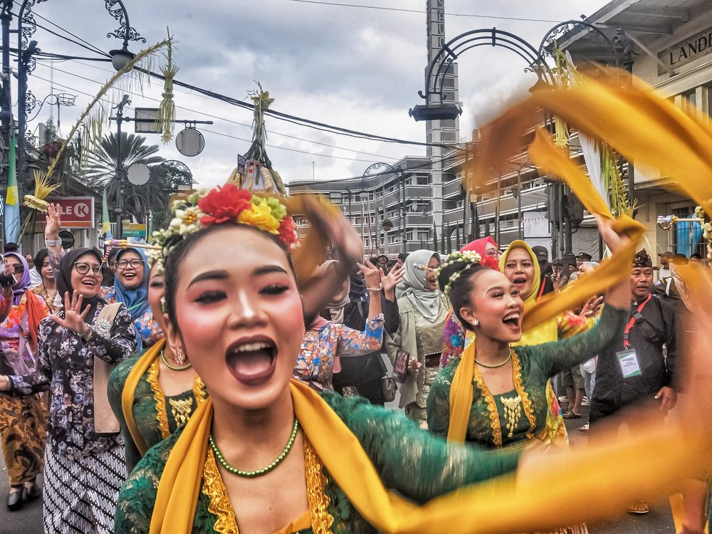 The Ketuk Tilu dancers express their extraordinary joy while performing on Asia Afrika Street in Bandung during the Carnival parade for the 80th anniversary of Indonesia's independence. Their background is the Savoy Homann Hotel, where heads of state from various parts of the world stayed during the 1955 Asian-African Conference.