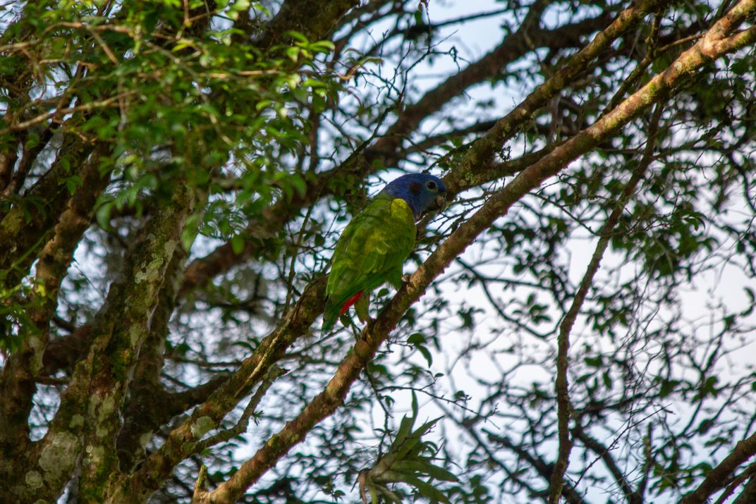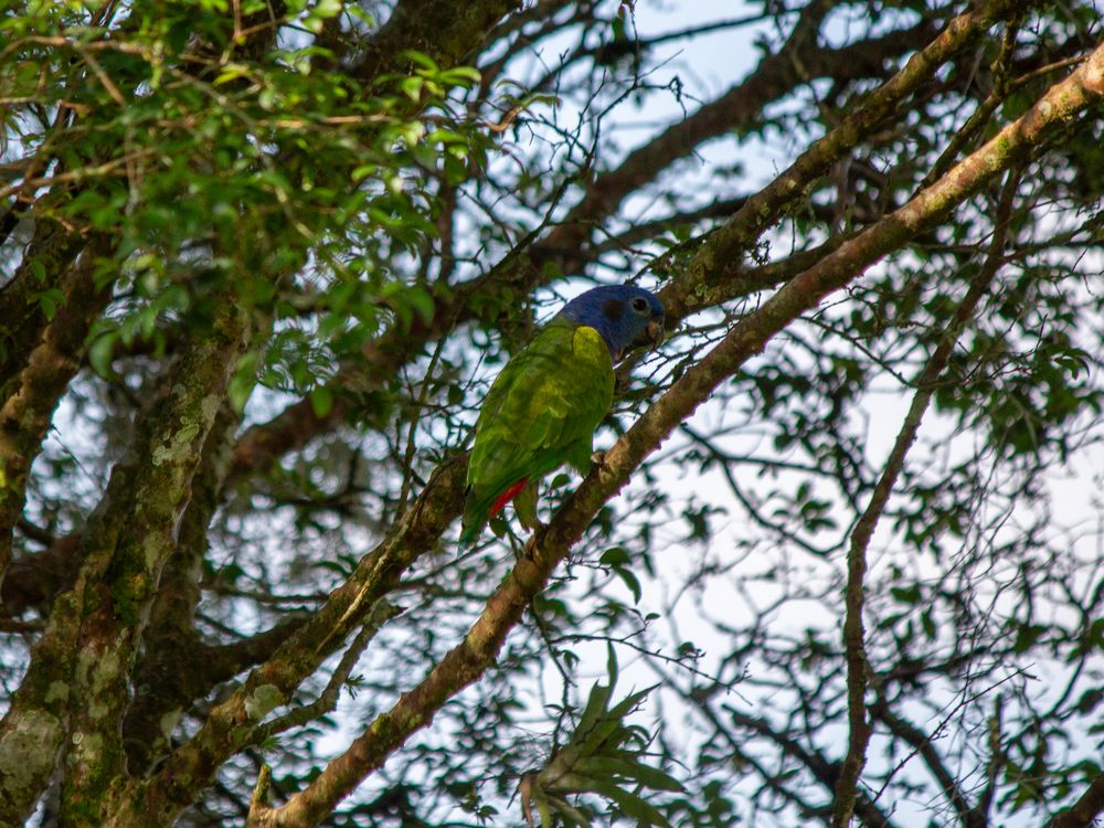 This shot captures a majestic Blue-headed Parrot (Pionus menstruus or similar Amazona species), perched quietly in a leafy tree within the Andean region. Its vibrant blue head and green body provide a spectacular contrast, yet surprisingly make it hard to spot amidst the dense foliage.